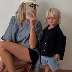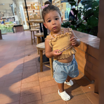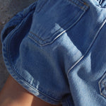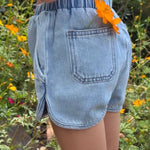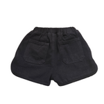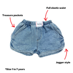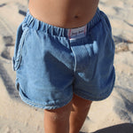 The easy wear 'pull'em up' or 'whip'em' off denim style your little one won’t want to take off! So comfy, casual and cute. You'll fall in love with the Kip Shorts in Sky Blue & Black Wash.